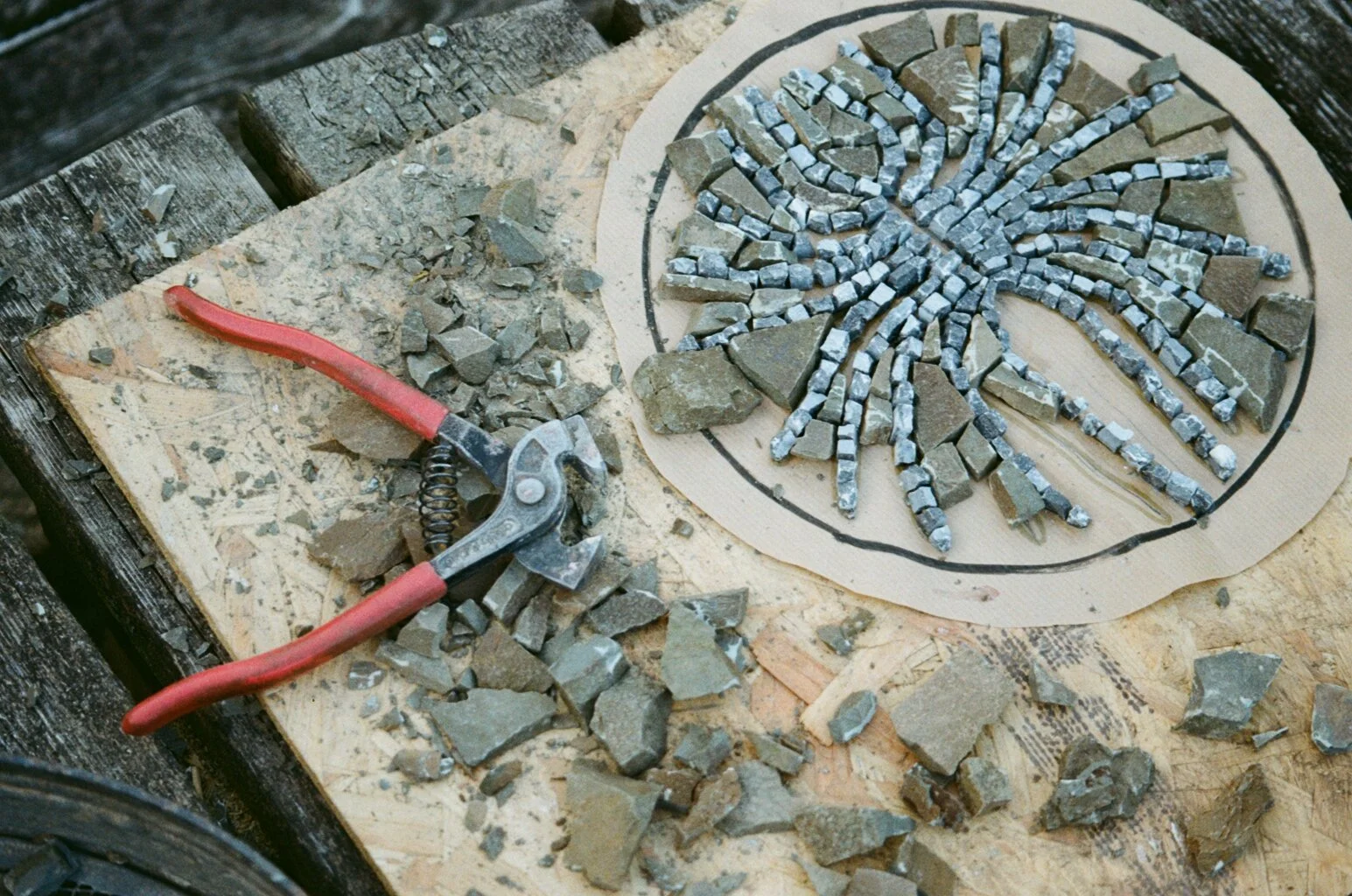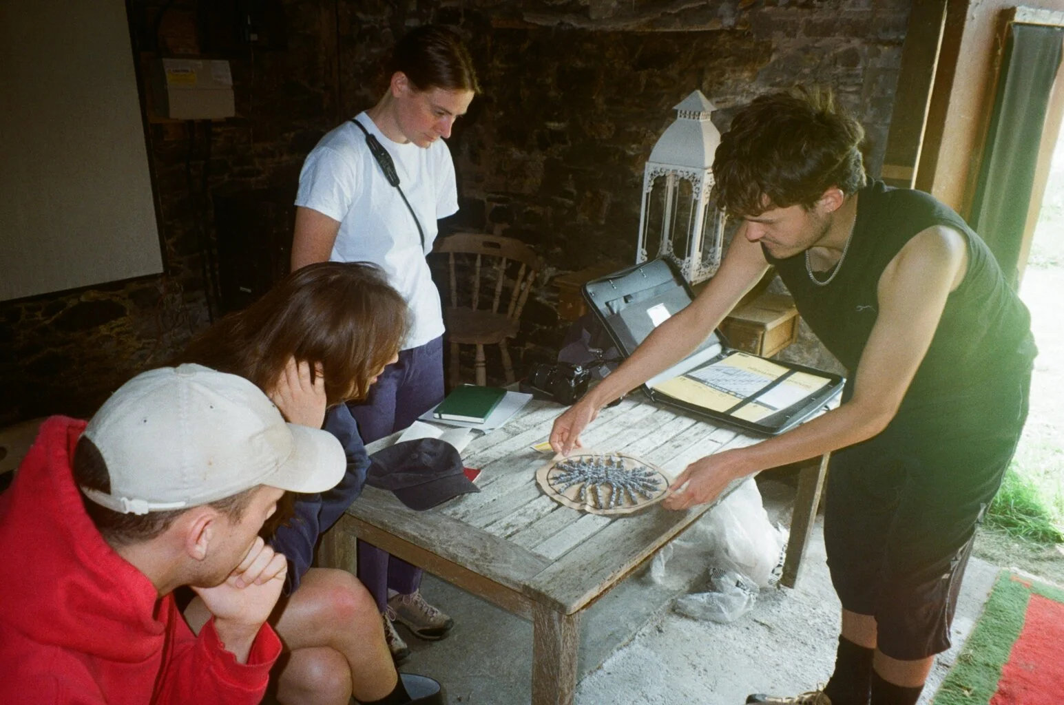 Every day one person would lead a workshop in the morning, giving us all a moment to come together collaboratively and learn from each others practices. The workshops included: the site specific install of a mosaic led by Andy, a reading and writing group facilitated by Lily, a walking and drawing group from by Crimson, Moth collection and categorisation run by Hamish, a song writing workshop exploring appropriation by Josh, and a game exploring individual versus collective practice organised by Beth. We also had the botanist Epithanny lead a morning of identification of local flora and fauna, and the financial and political elements of local wildlife conservation. Our afternoons and evenings were for personal exploration. This involved collating resources for future artworks, sharing texts and exploring the landscape.